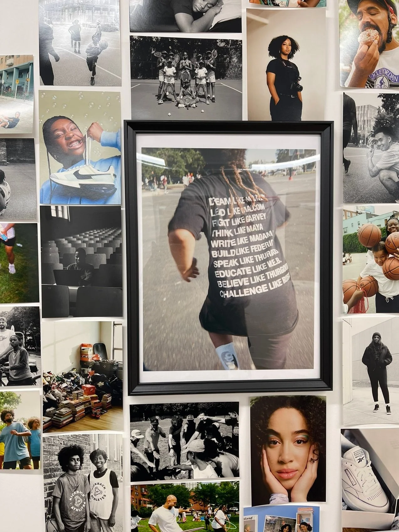 On one wall, a collage is formed out of photographs taken by a mix of professional and amateur photographers in the city. The images, both grayscale and rich-coloured, capture everything from dancers and athletes, the smile of a young child to a pair of Air Jordan sneakers. Across the mural, sneakers dangle from two basketball nets drilled into the wall — the kind of net and backboard you find in your school playground or local park.