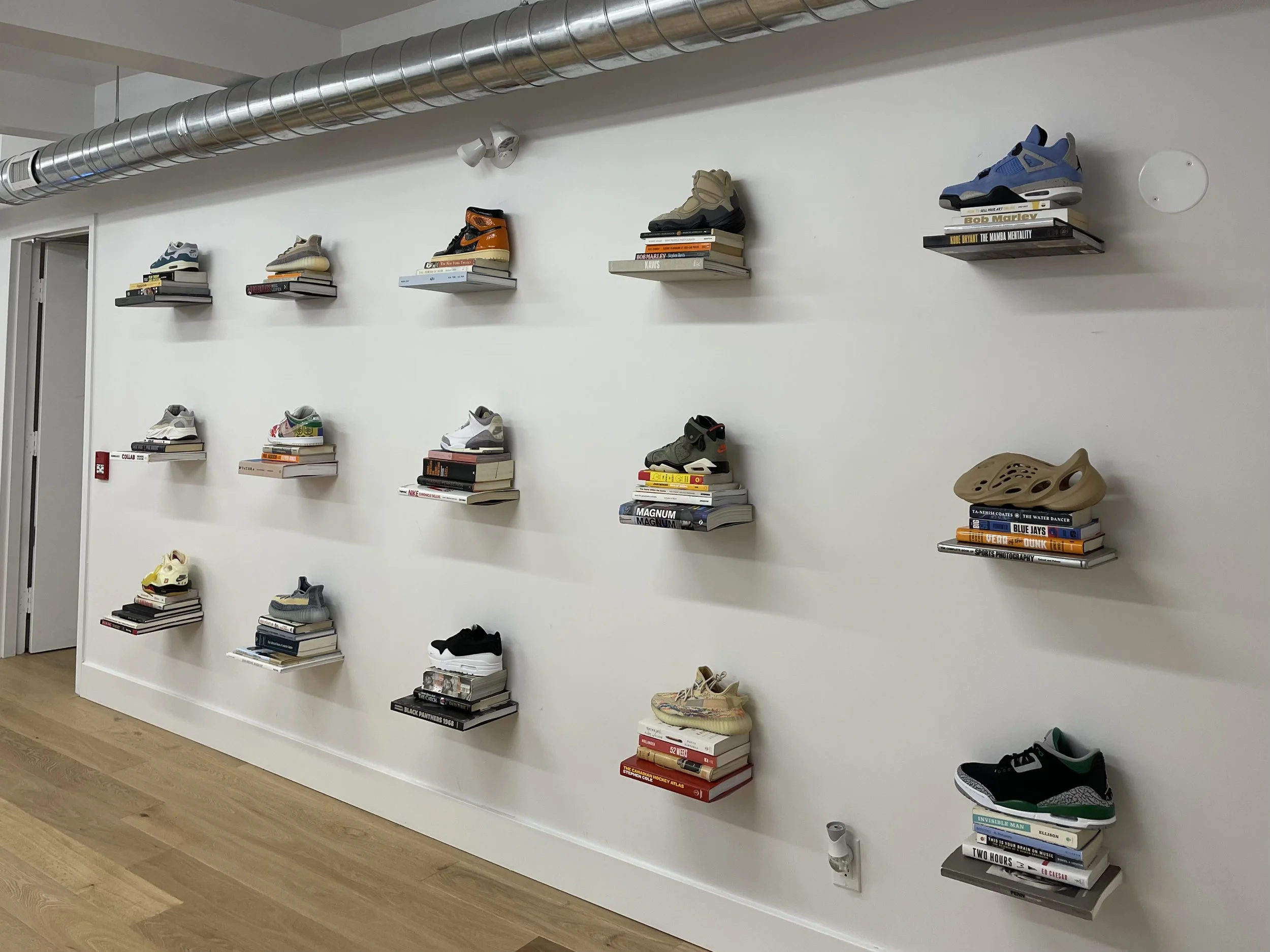 Down the hall, the sidewalk sign comes to life. Sixty-two books about sports, photography, art, and history form shelves displaying classic and coveted sneaker silhouettes. The event, The Gallery, is raffling off the shoes to help fund the organization’s youth programming for next year, and they all belonged to The Kickback’s founder Jamal Burger.